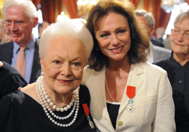 FILE PHOTO: Actresses Jacqueline Bisset (R) and Olivia de Havilland pose together after they were awarded with the Legion d’honneur during a ceremony at the Elysee Palace, September 9, 2010. REUTERS/Philippe Wojazer