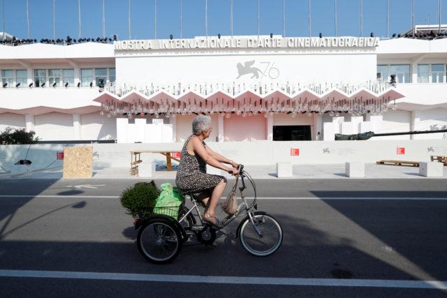 A woman rides a bicycle past the Palazzo del Cinema at the 76th Venice Film Festival in Venice, Italy, August 27, 2019. REUTERS/ Yara Nardi