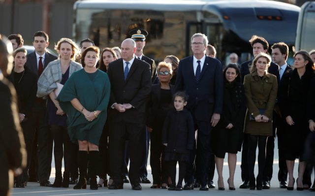 Family members watch as the flag-draped casket of former U.S. President George H.W. Bush is carried by a joint services military honor guard during an arrival ceremony, at Andrews Air Force Base, Maryland, U.S., December 3, 2018. Alex Brandon/Pool via REUTERS