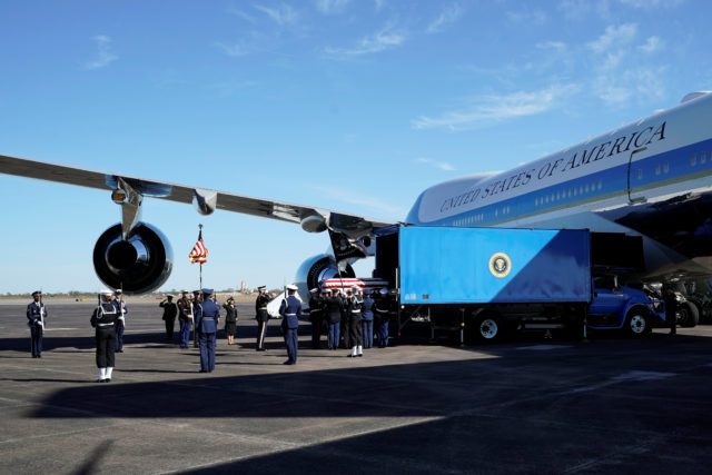 The flag-draped casket of former President George H.W. Bush is carried by a joint services military honor guard to Special Air Mission 41 at Ellington Field in Houston, Texas U.S., December 3, 2018. David J. Phillip/Pool via REUTERS