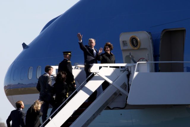 Former President George W. Bush and former First Lady Laura Bush wave while boarding the Special Air Mission 41 plane during a departure ceremony in honor of George H.W. Bush at Ellington Field Joint Reserve Base in Houston, Texas, U.S., December 3, 2018. REUTERS/Loren Elliott