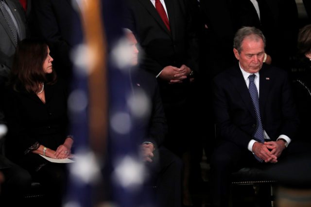 Former U.S. President George W. Bush lowers his head during ceremonies for his father, the late former U.S. President George H.W. Bush inside the U.S. Capitol rotunda in Washington D.C., U.S., December 3, 2018. REUTERS/Eric Thayer