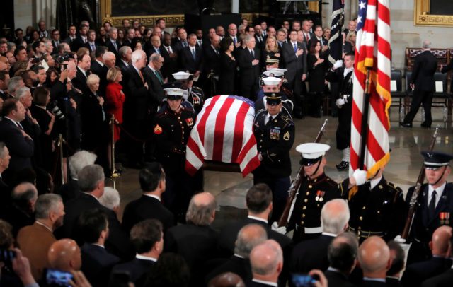 A military honor guard carries the casket during ceremonies for the late former U.S. President George H.W. Bush inside the U.S. Capitol rotunda in Washington D.C., U.S., December 3, 2018. REUTERS/Eric Thayer