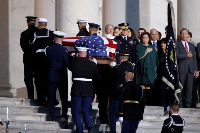 The flag-draped casket of former President George H.W. Bush is carried by a joint services military honor guard to lie in state in the rotunda of the U.S. Capitol, Monday, Dec. 3, 2018, in Washington. Alex Brandon/Pool via Reuters