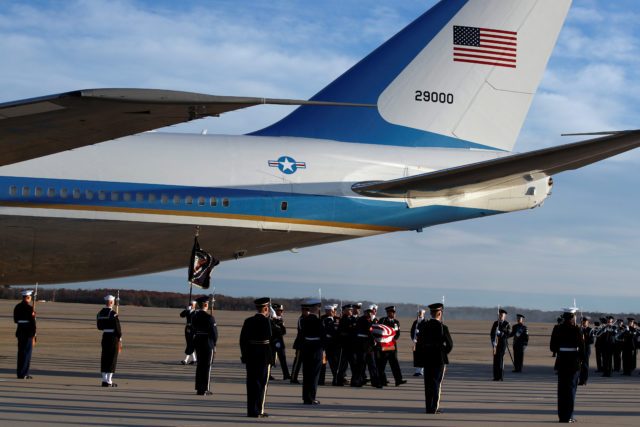 The flag-draped casket of former U.S. President George H.W. Bush is carried by a joint services military honor guard to the hearse, at Andrews Air Force Base, Maryland, U.S., December 3, 2018. Alex Brandon/Pool via REUTERS