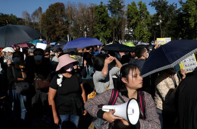 FILE PHOTO: Joy Luk prepares her megaphone as fellow protesters prepare to march in Hong Kong, China, December 8, 2019. REUTERS/Leah Millis