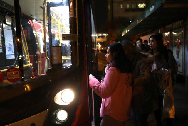 FILE PHOTO: Joy Luk (L) gets on a bus with the help of a stranger as she makes her way home at the end of a work day in Hong Kong, China December 5, 2019. REUTERS/Leah Millis